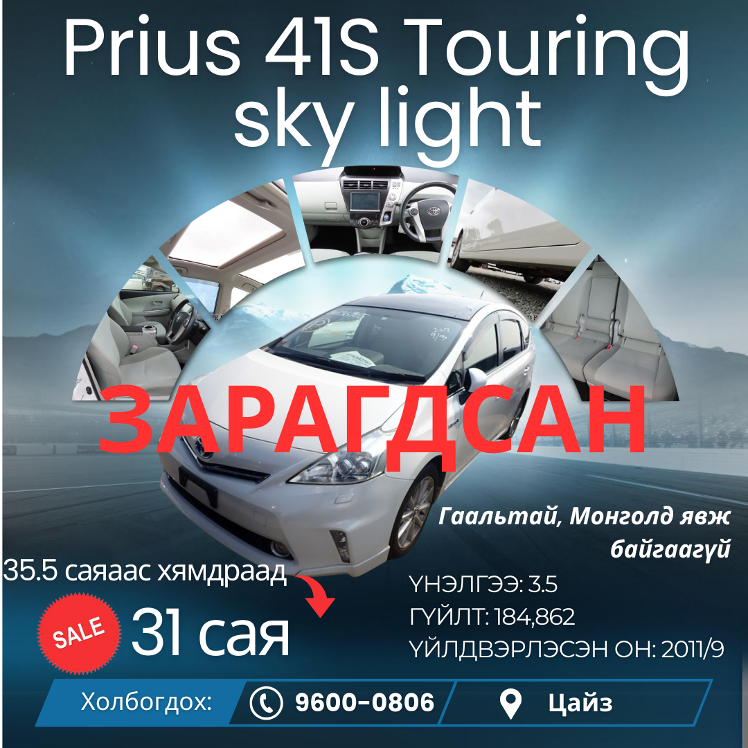 📌PRIUS 41 G📢3 салаа их гэрэлтэй📢Pioneer өөрөөсөө ориг хөгжимтэй📢Их гэрэл шүршигчтэй📢Хайлшин обудтай📢Өвлийн ориг, Япон дугуйтай📢Арьсан руль📢Запас дугуйтай📢2 ширхэг түлхүүртэй📢Маш бага гүйлттэй📢Сэв, зураасгүй  🆗УЛААНБААТАРЫН ДУГААР БЭЛЭН ✨Үйлдвэрлэсэн он: 2011/10✨Үнэлгээ: 3.5✨Өнгө: Улаан✨Гүйлт:80,560 км✨Үнэ: 31.5 саяаас хямдраад 26.5 сая